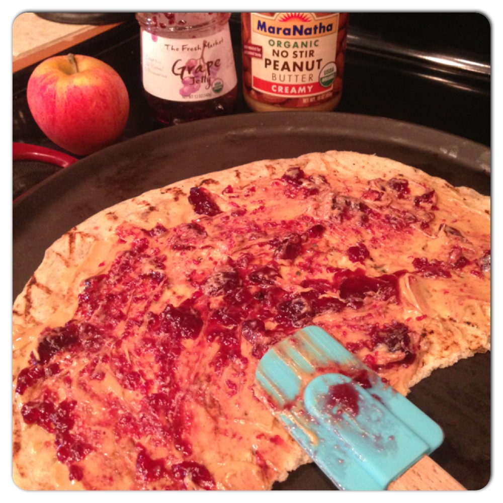 So today I came up with an awesome lunch dish that my kids absolutely loved! A PB & J pizza! Ha, before you get impressed, the only reason why my taste buds led to this concoction was because I had to come up with something to eat with the very few ingredients I had (haven’t been to the grocery store yet). Because I had 3/4 of a store bought pizza crust already in the fridge, and always keep my fridge stocked with Pb & J, viola! : ) It not only is healthy and vegan, it was delicious and my kids loved it!