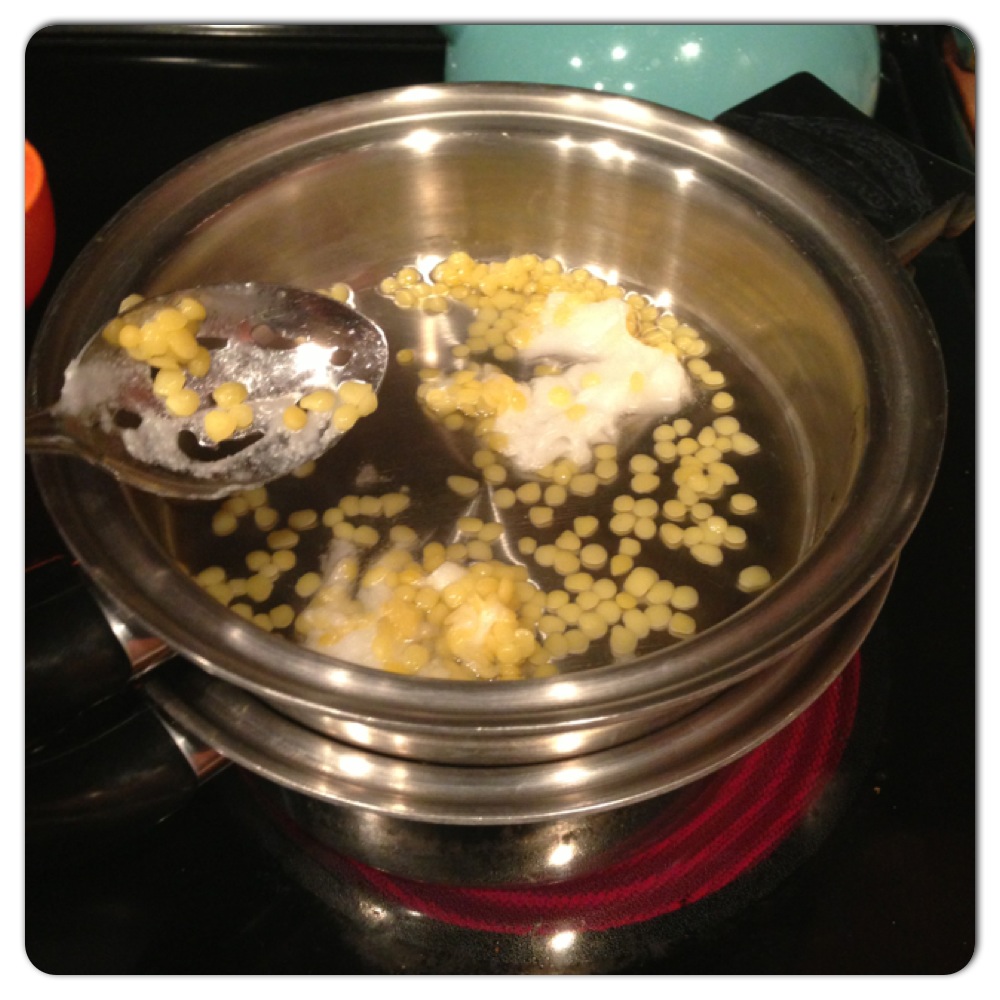 In a double boiler (or two pots stacked on top of each other with the bottom one containing boiling water), add the beeswax pellets and coconut oil. Stir and let sit until pellets are completely melted.