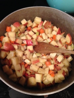 Chop and dice all veggies then place in pot with butter. Add salt and pepper and cook for about 5 minutes.