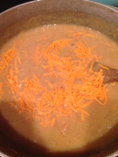 Pour puree into pot then add garlic powder, Tony’s, the other cup of milk, and 1 cup of cheese substitute.