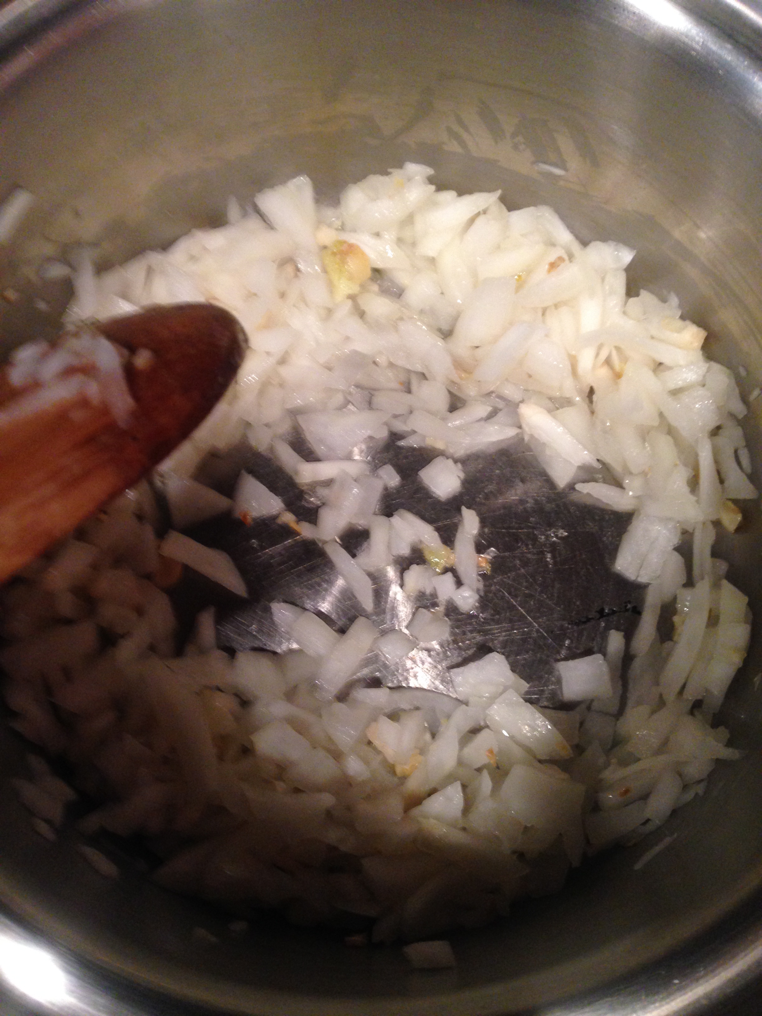Chop garlic and onion then saute them on med-high heat till almost translucent (about 5 min).