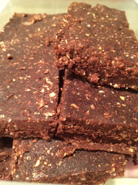 Mix altogether in blender (it’s good to start with nuts, then cocoa powder and oats…then add the rest). Take out and flatten and spread out in baking dish. Place in freezer for about 30 minutes. Take them out of the freezer and use a pizza cutter to cut out desired size bars!