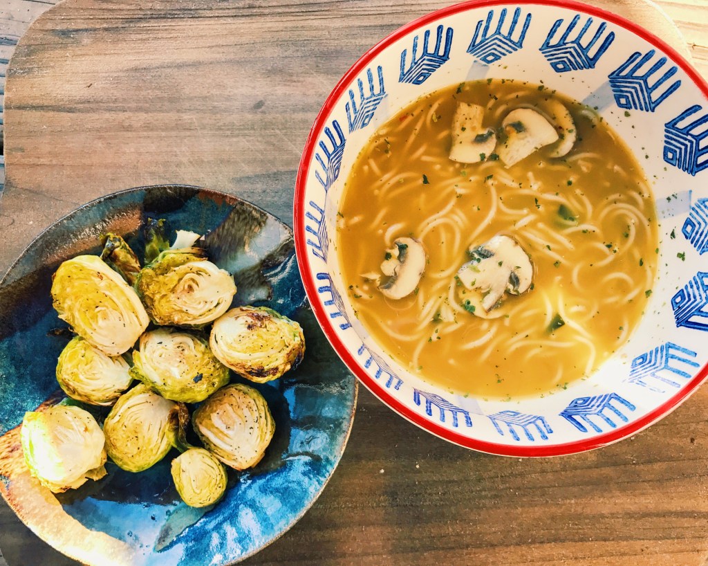 Simple as pie. I cooked the ramen according to package directions except I only used a 1/2 pack of seasoning rather than the whole thing (and I didn’t add it until later). Once I drained the noodles, I heated up the ramen broth, added a splash of Siracha, a splash of lemon juice, sliced mushrooms, and the 1/2 pack of seasoning. You can add other veggies, but I kept it simple so my kids wouldn’t get scared off. I cooked it on med low heat until desired temperature. I also served it with balsamic and agave roasted Brussels sprouts!